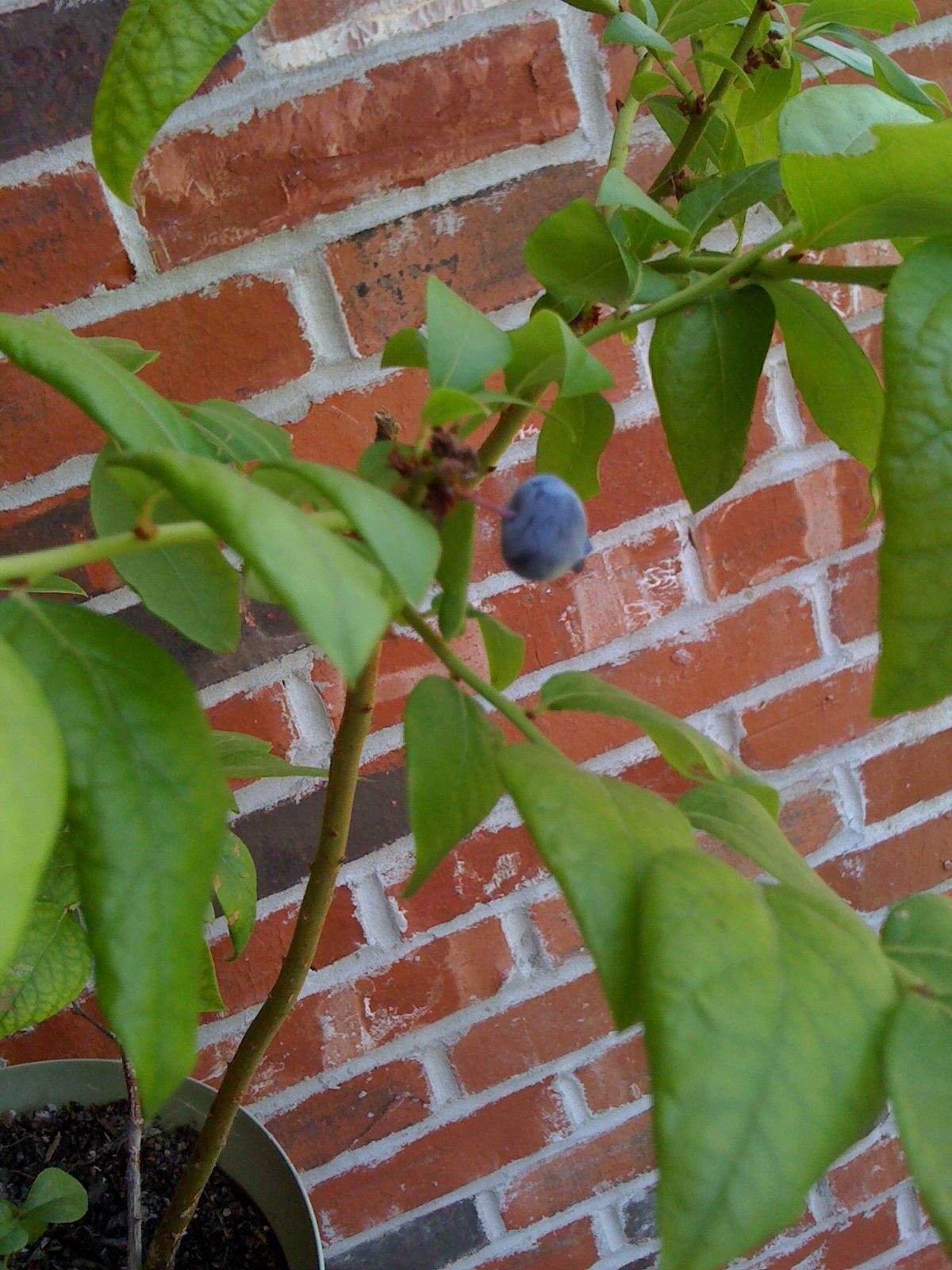 Our blueberry bush has produced just one blueberry so far, and until Sunday afternoon, that one berry had remained a pale green. Then, voilà! Somehow between my morning watering and my evening walk in the garden with Chris, it transformed into an amazing blueberry blue. I finally picked it this afternoon, and it was perfectly sweet and tart. Delicious!