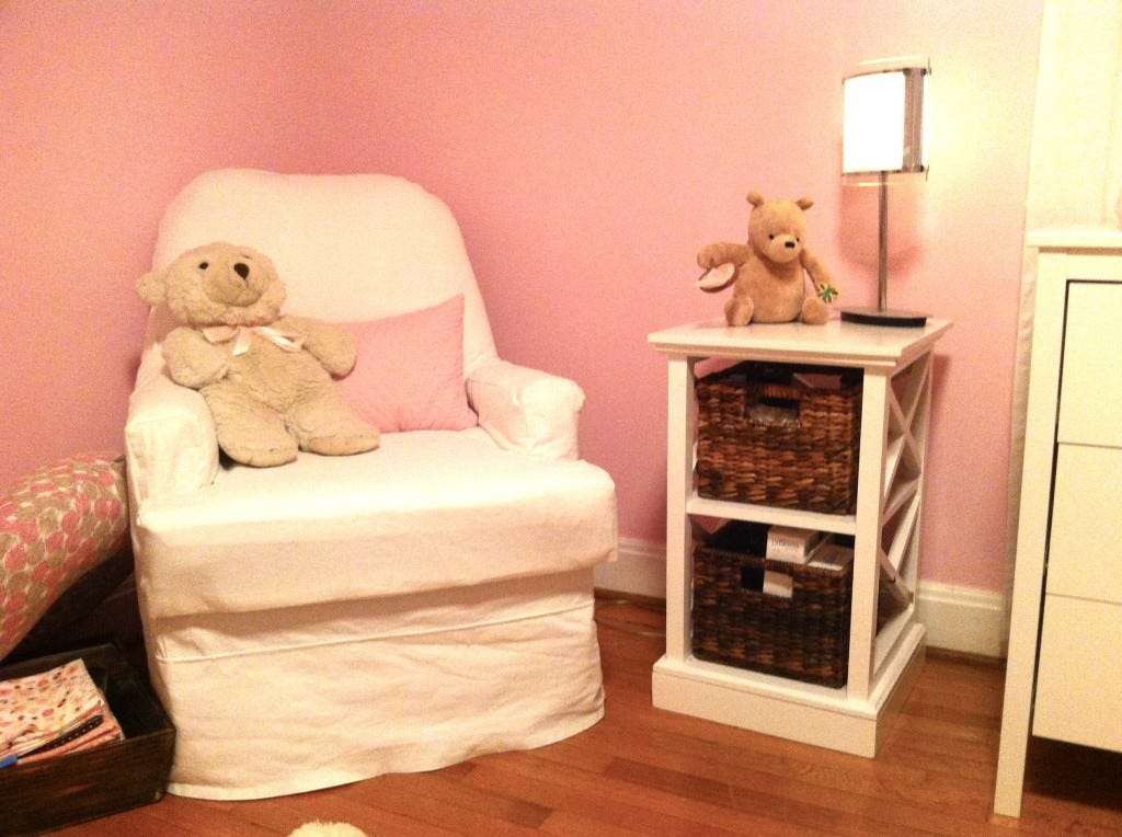 Over the weekend, we finally finished shopping for and setting up the furniture for Mackenzie's nursery. I found this side table on clearance at TJ Maxx for $20. I already owned the baskets, and they just happened to fit perfectly. The lamp is one Chris and I have had for a while, too. It's not exactly the style we originally had in mind, but it casts …