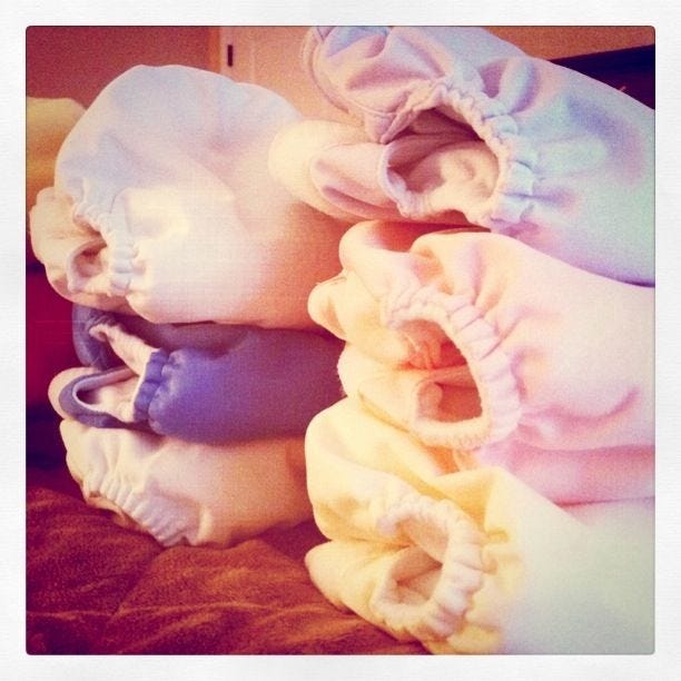 I am proud to report that we are still going strong with our cloth diapering. We have revised and simplified our approach, and we are really pleased with how it is going. We started out with six all-in-ones, lots of prefolds with covers, and six one-size pocket diapers with inserts. After a few weeks and even switching brands, I gave up on the prefolds…
